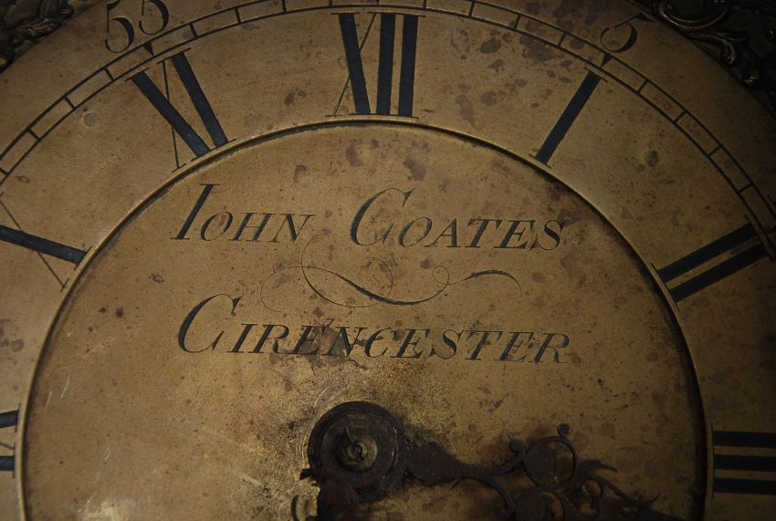 An 18th century John Coates of Cirencester brass faced longcase clock movement set within a later 19th century oak geometric panelled grandfather clock case. The brass faced dial with decorative spandrels, roman numeral chapter ring with date aperture lower centre. Notation to centre for John Coates. Set within a later oak trunk with geometric panel work and barleytwist columns.