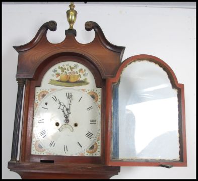 A Late 18th early 19th Century oak and mahogany longcase clock. The case with a twin swan neck pediment above two tapering reeded columns flanking the break arch 12" painted dial, the dial painted with fruit and Arabic numerals with a subsidiary second dial and date aperture the eight day movement striking on a saucer bell, the case with a crossbanded door flanked by canted corners above a panelled base raised upon a shaped apron and bracket feet complete with pendulum and two weights