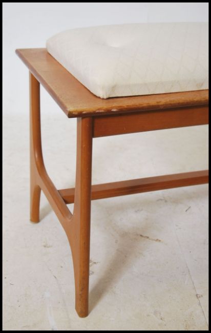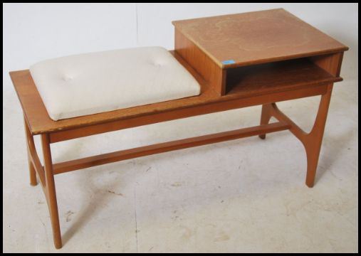 A 1970's retro telephone hall table seat combination in teak having a pad seat with telephone stand and open recess beneath