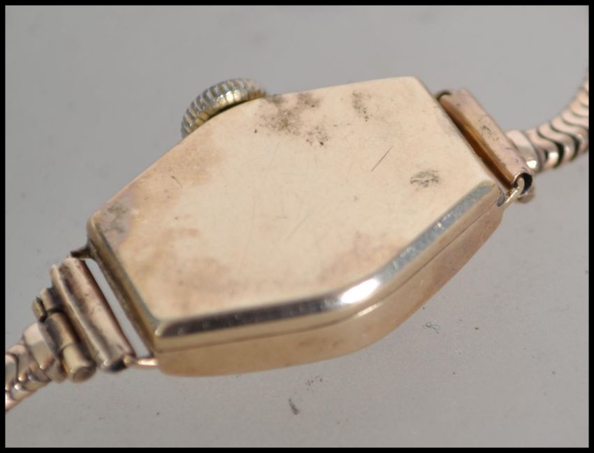 A vintage 9ct gold ladies wristwatch set to a snake linked 9ct gold bracelet complete with safety chain. The dial with faceted hands. Weight 14g