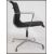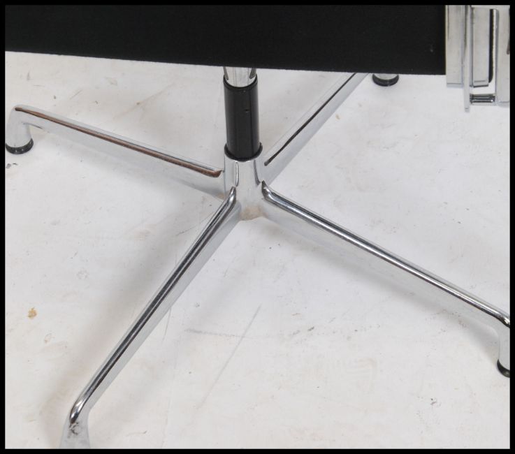 A 20th century retro style Eames chrome and black fabric r upholstered shaped office swivel chair with elbow rests. Measures 95cm high x 56cm wide x 73cm deep.