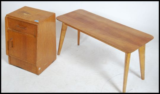 A vintage G-Plan bedside cabinet  in natural oak together with a walnut coffee table in the manner of Vanson having tapered supports. Measures 44cm high x 88cm wide x 38cm deep.