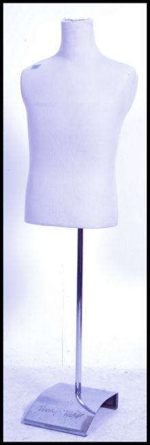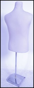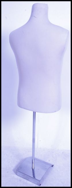 A 20th century floorstanding shop mannequin - haberdashery dummy being raised on a chrome plinth being marked for Hua Meir. Measures 144cm high x 45cm wide x 32cm deep.