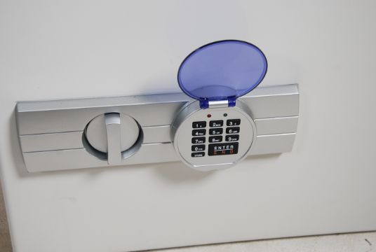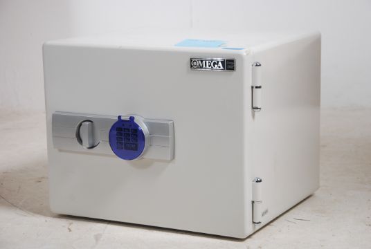 A contemporary floor safe by Omega with touch button  control ( with keypad number ) in working order. Measures 35cm high x 45cm wide x 38cm deep.