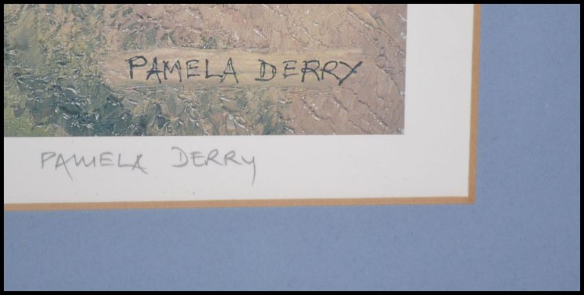 Two 20th century framed and glazed signed Pamela Derry prints. Limited edition Rain in the air 38/850 and artist proof Late in July. Measures 28cm high x 22cm wide.