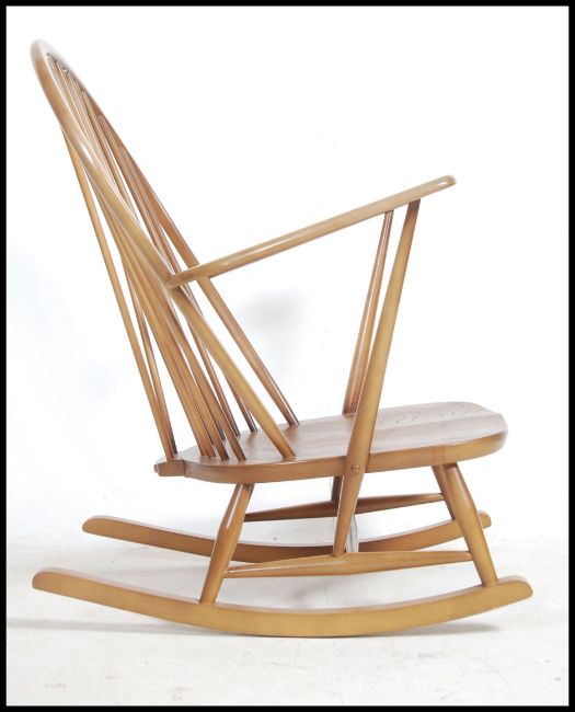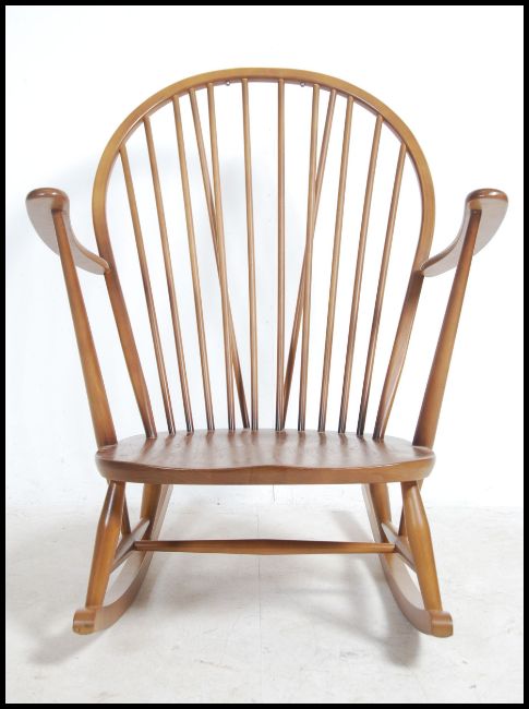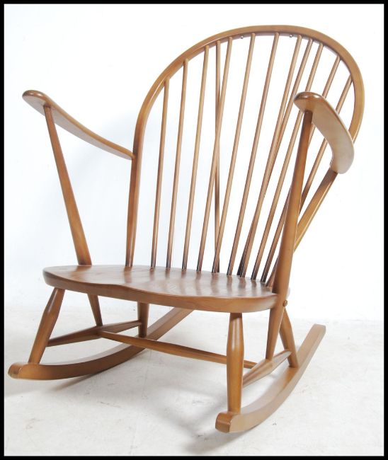 A 20th century Golden Dawn Ercol beech and elm Quaker spindle back rocking chair