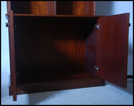 A large Regency revival mahogany breakfront  bookcase of upright form having plinth base and flared cornice with open bookcase having multiple adjustable shelves above cabinets beneath. Matching similar large bookcase in 1448. Measures 211cm high x 107cm wide x 51cm deep.