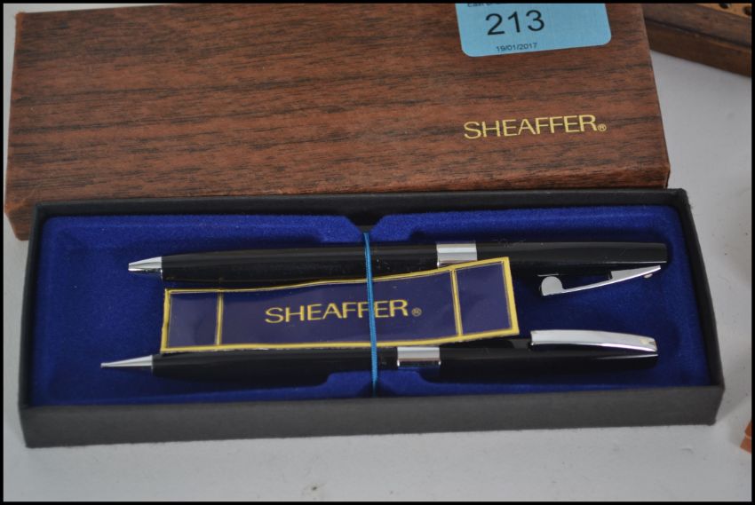 A good mixed lot to include 2 Sheaffer cased pen sets, a polished blue stone bottle stopper, 2 vintage Cribbage boards from the mid 20th century along with a hinged lidded tea tin from Fortnum And Masons. The tin measures 13cms high.