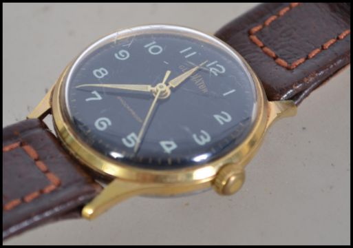 A vintage mid century Gentlemans Gladiator wristwatch having black dial with baton numerals being set to a leather strap