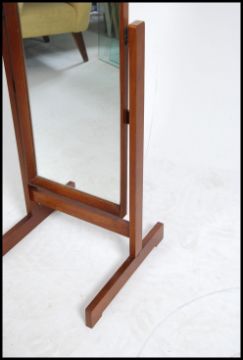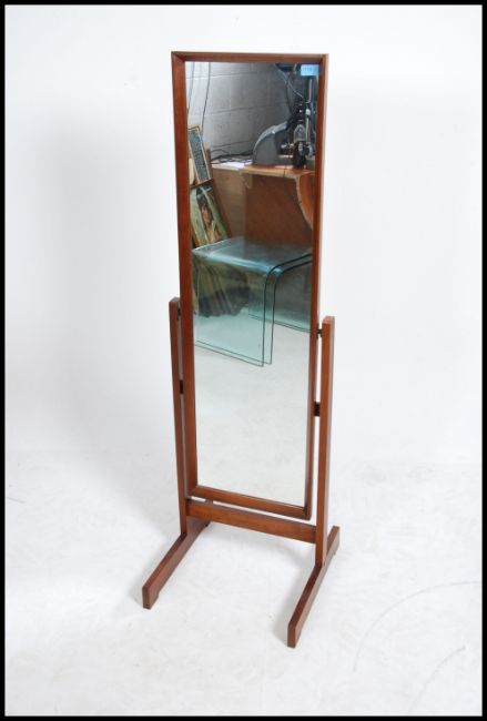 A mid century mahogany floor standing cheval mirror raised on squared supports and arms with long rectangular mirror. Measures 140cm high x 36cm wide x 45cm deep.