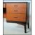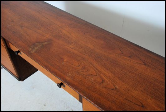A 1970's retro teak wood writing table desk raised on squared legs with a series of drawers having recessed handles flanking the central kneehole recess