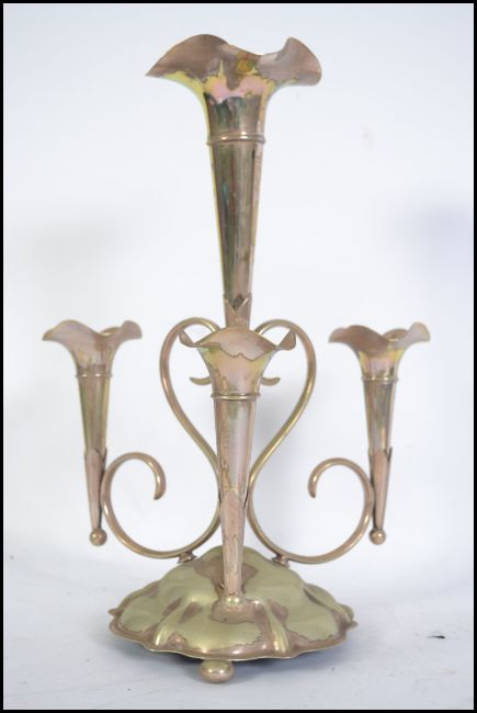 An early 20th century silver plated 4 sconce epergne centrepiece of tulip form raised on ball feet ( see illustrations ). Measure 39cm high.
