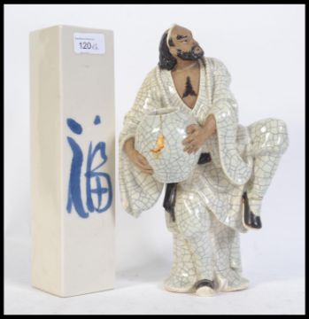 A late 19th century / early 20th century crackle glaze Japanese ceramic figure of a man raised on one leg supporting a bowl together with a Chinese / Japanese vase of rectangular upright form having white ground with character marks in blue to the front. Stamped to base. Tallest measures 28cms high.