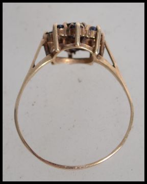 A 9ct gold and sapphire ladies ring, the central cabachon sapphire with surround sapphires, all claw mounted. The shank London hallmarked1973. Total weight 1.8g / Size S