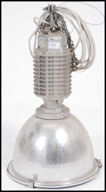 An Industrial factory pendant light with half moon shade in the manner of Zumbotel. Complete with chain. Measures: 62cms high.