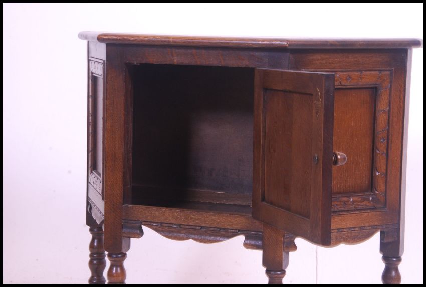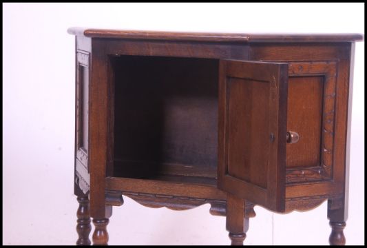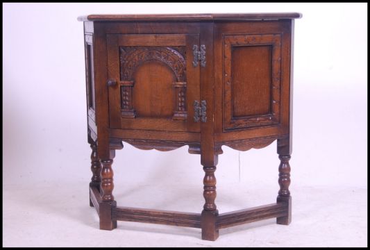 An Ercol oak 'Colonial ' hall cabinet raised on block and turned legs united by stretchers having carved single door to the shaped cabinet top above. 71cm high x 81cm wide x 33cm deep.