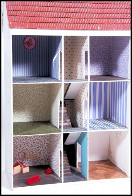 A vintage 20th century  vintage  dolls house having decorated interior ( see illustrations) front opening. Measures 100cm high x 64cm wide x 33cm deep.