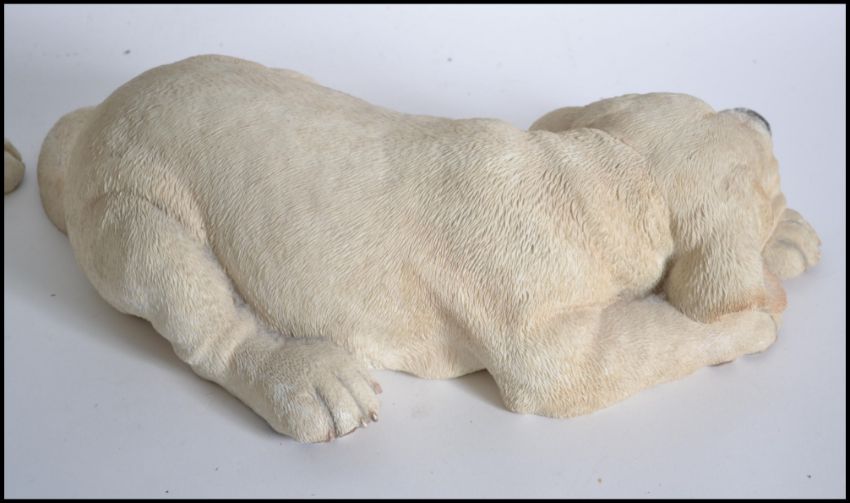 A pair of ' Puppy Love ' Labrador large puppy dogs by Country Artists.  One labelled and numbered 02695 - Labrador scratching and the other numbered 02693 - Labrador lying.  Both marked with stickers to underside. The tallest measures 26cm high.