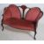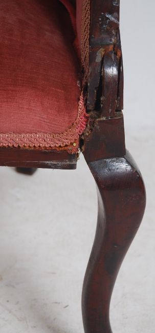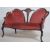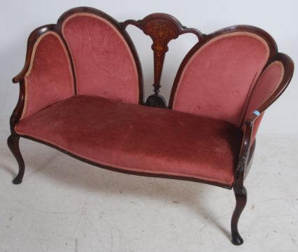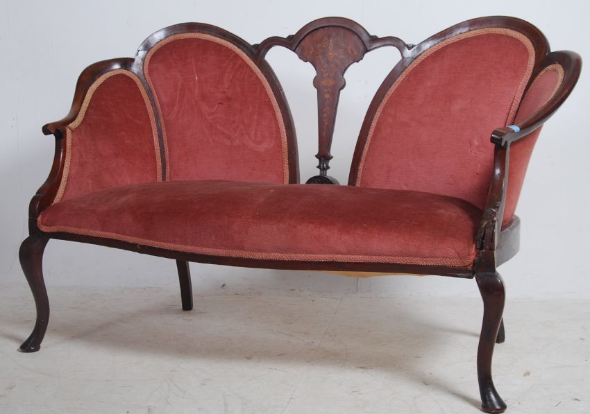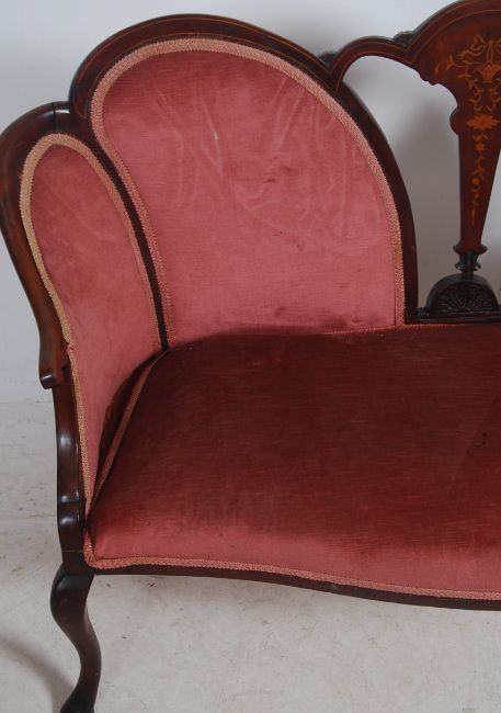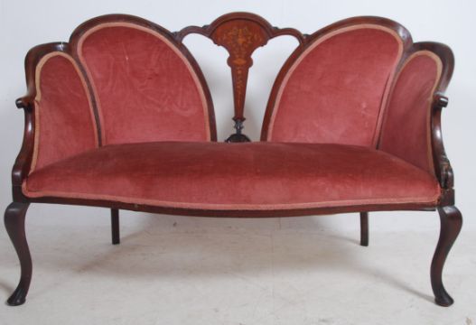 An Edwardian mahogany inlaid spoon back conversation sofa settee having shaped legs with pad feet. Pink velour upholstered seat with show wood frame having inlaid central back splat. Measures 87cm high x 142cm wide x 69cm deep.