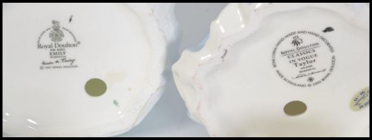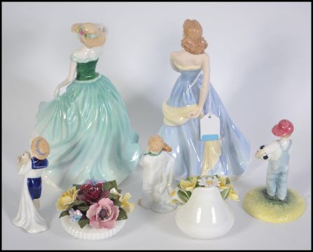A good group of Royal Doulton figurines to include Taylor HN4496 Emily HN4093 Pride and Joy HN4102 Sleepy Head HN3761 Special Friend 3607 and two flower baskets, Tallest measures 23cms high.