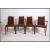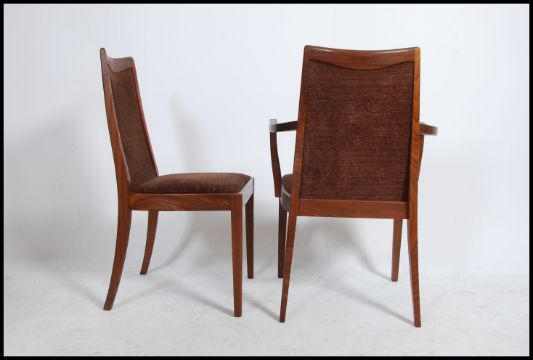 A set of four retro G Plan teak wood dining chairs having a brown velour seat pad and backrest. One chair being a carver with applied G Plan label to the underside. Measures 90cm high x 60cm wide x 52cm deep.