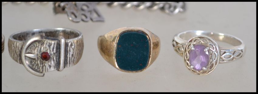 A selection of six silver rings to include silver gilt together with a hallmarked silver charm bracelet having a heart lock and charms, hallmarked Birmingham. Weight 40g.