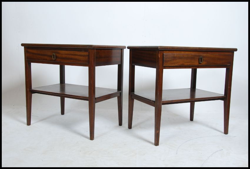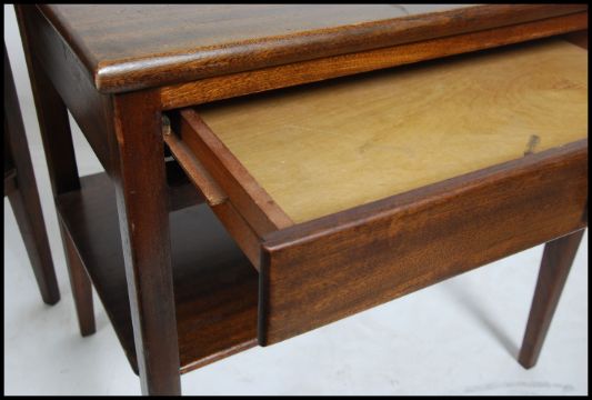 A pair of mid century mahogany bedside tables raised on square tapered legs with lower tiers under single drawers being marked for DS Vorster & Co. Measures 60cm high x 61cm wide x 40cm deep.