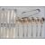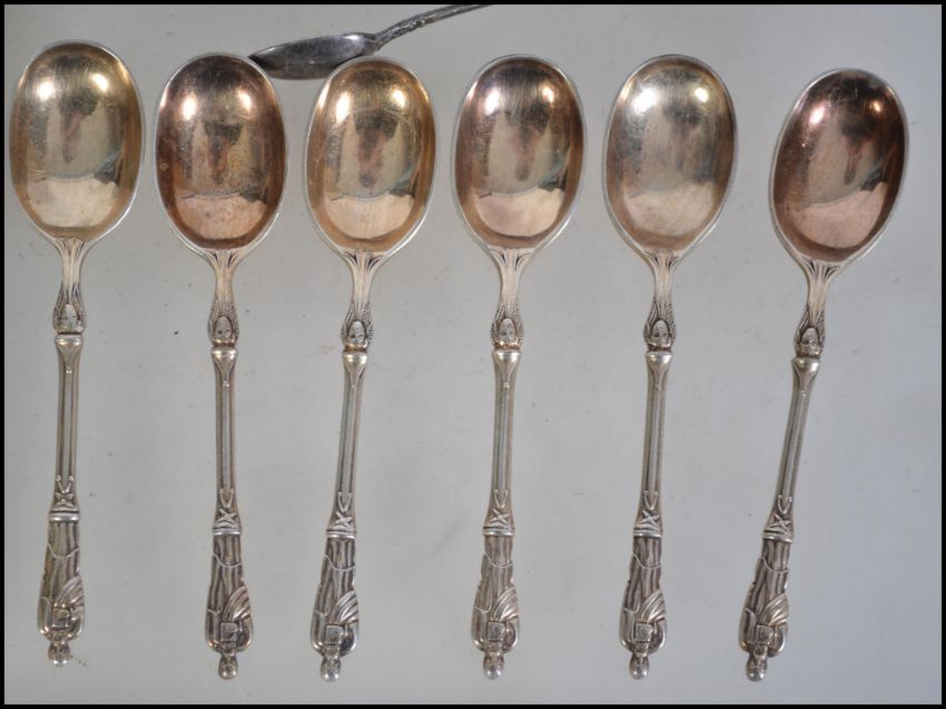 A collection of silver hallmarked collar knives with faux mother of pearl handles. Hallmarked for JS of Sheffield. Together with a set of 6 Elkington apostle spoons and a set of tongs.