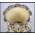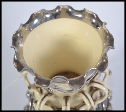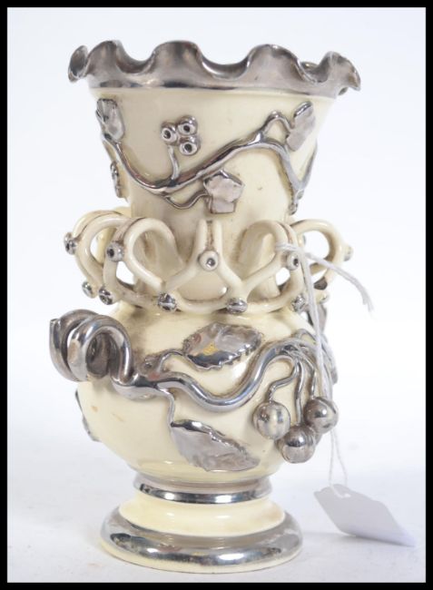A 19th century lustered embellished vase having vine and fruit with silvered scroll detail on cream ground stamped to base. Measures 15cms high.