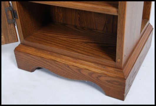 A contemporary Ercol ' Golden Dawn ' pedestal upright display of elm construction. The cabinet with glazed door having shelved interior with further recessed shelves to the sides. Measures 76cm high x 44cm wide x 39cm deep.