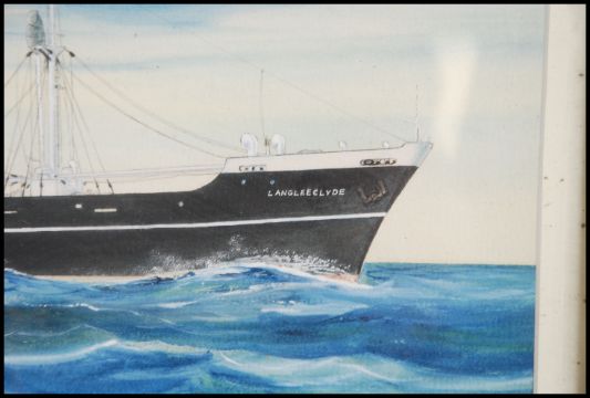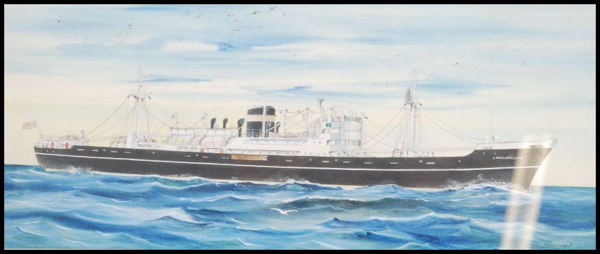 Clavero Sebastian - Barcelona 23 / 4 / 1955 Espana. Goache on paper painting - shipping line - agents painting of the liner L Angleeclyde. Framed and glazed. Measures: 24cms high x 56cms wide.