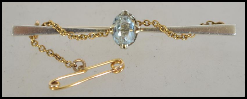 An Art Deco 15ct gold bar brooch with oval cut aquamarine with C clasp and safety chain. Marked 15ct tests 15ct gold. Measures 5.5cms.