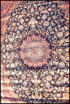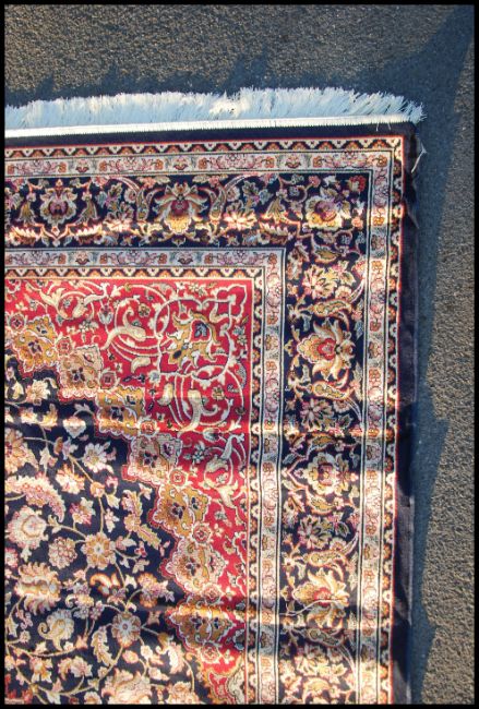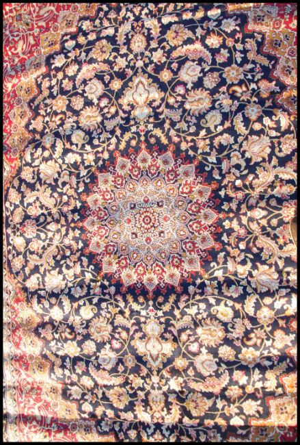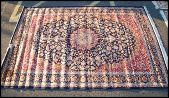 A large Iranian / Persian Keshan carpet - rug having blue ground with geometric decoration and borders. Measures 2.8m x 2.0m