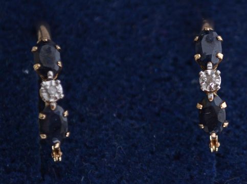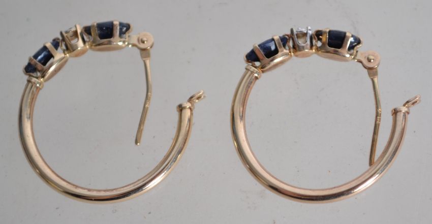 A pair of 9ct gold hoop earrings set with sapphires and diamonds having leaver clasps.