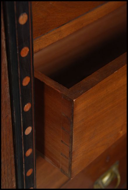 A Victorian Arts & Crafts mahogany inlaid triple wardrobe linen press compactum. Raised on a plinth base with a double upright hanging wardrobe over shoe drawers. Flanked by a further robe with linen press slides over chest of drawers. The compactum with stunning organic ebonised inlaid details. Finished with flared edge cornice atop. Dismantles into 4 pieces for ease of movement. Matching dressing table and pot cupboard in lots 1451 & 1453. Measures 204cm high x 190cm wide x 65cm deep.
