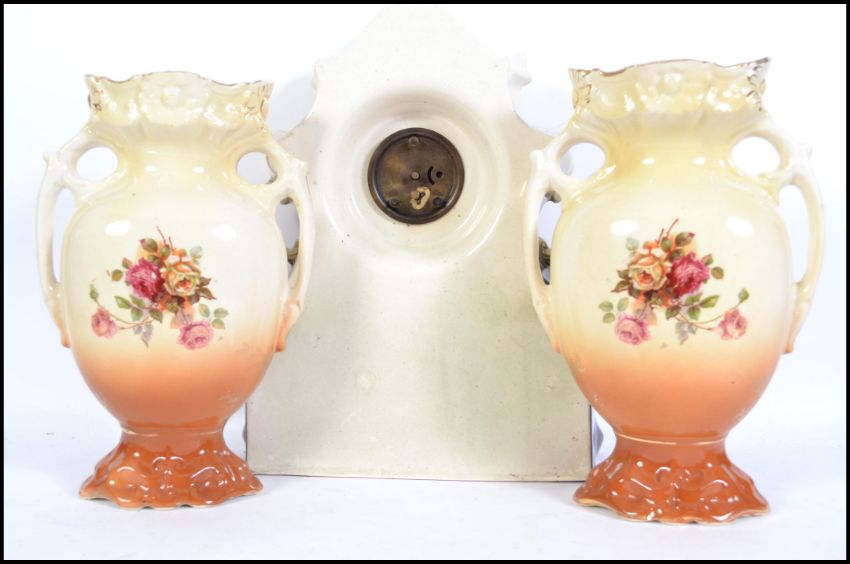 A late 19th early 20th century Staffordshire transfer printed clock surround with near matching garniture. The clock surround being fitted with an eight day movement. The clock measures 35cm high.