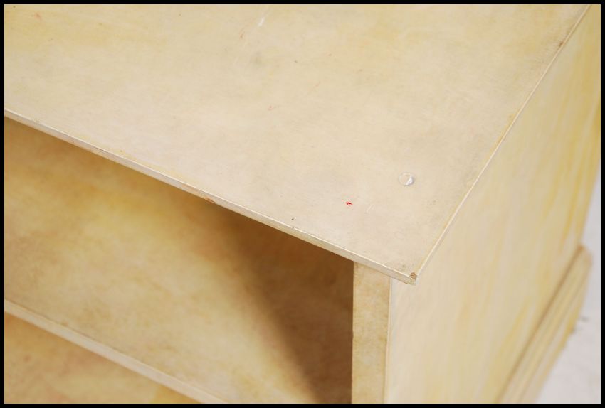 An unusual painted large breakfront bookcase cabinet having a flared cornice over open window shelves with mirror lined back to centre. The breakfront base with further shelves being raised on a plinth base. Measures 223cm high x 130cm wide