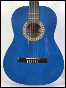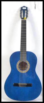 A 20th century Stagg acoustic six string Spanish style guitar finished in blue with carry bag.