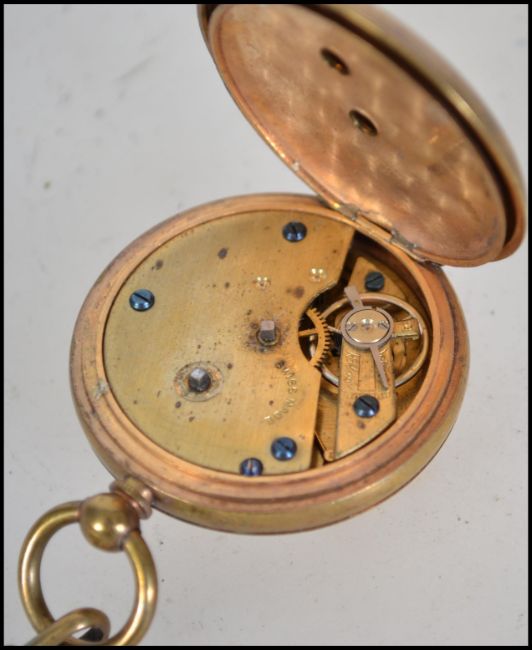 A silver 925 ladies open faced fob watch, the dial marked for H Samuel of Manchester. The face with faceted hands and decorative face set in a silver rococo case. Weight 35.9g. Together with a brass open faced early 20th century pocket fob watch on albert chain