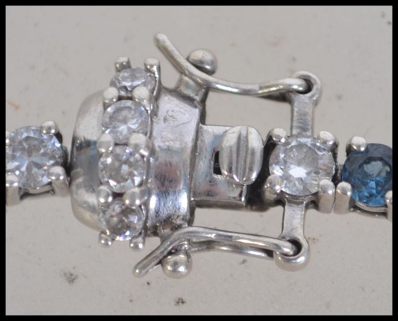 A ladies decorative silver 925 tennis bracelet adorned with 44 aquamarine coloured stones and cz's. Total weight 15.9g / Size 20cms long
