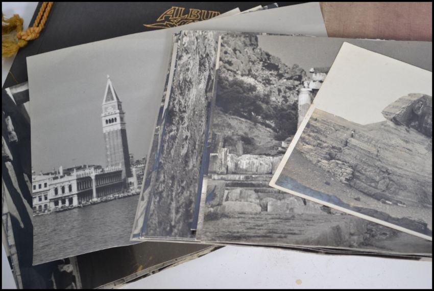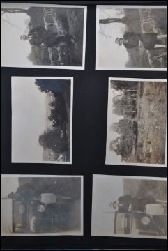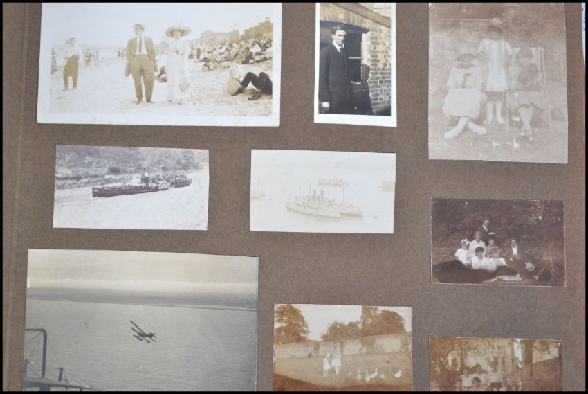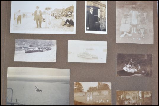 Box of old photo albums (5) + loose. Noted pictures of: motor cars, Prince of Wales (EVIII) in uniform, Naval shipping/aircraft & early Somerset.