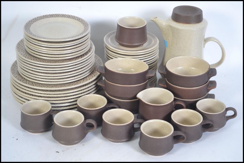 A Purbeck Pottery nine person Brown Diamond Purbeck service, to include dinner plates, side plates, coffee pot, cups, sugar bowl, creamer, bowls, saucers etc please see images