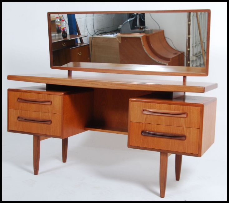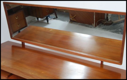 A 1970's retro teak wood G-Plan suspension set dressing table having pedestals of drawers raised over tapered supports with long mirror atop. Together with matching stool. Measures 125cm high x 145cm wide x 46cm deep.