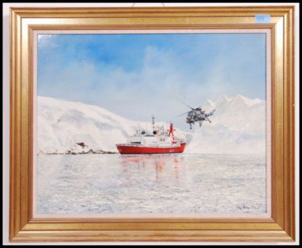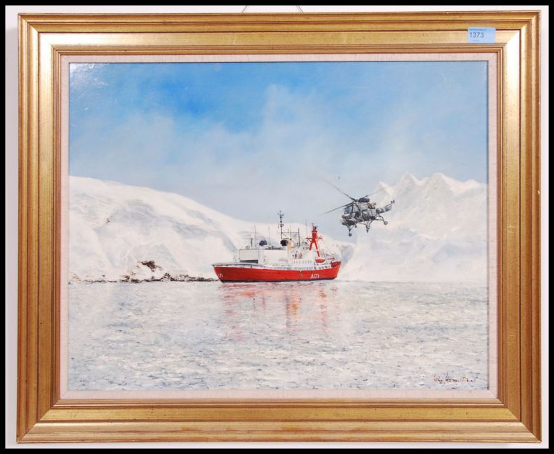 A framed oil colour painting on board by John Hamilton 1919-1993 of HMS Georgia among the icebergs South Georgia ( The Falkland Isles ) with helicopter in flight. Signed to the corner with label to the verso. Measures 45cm high x 58cm wide.