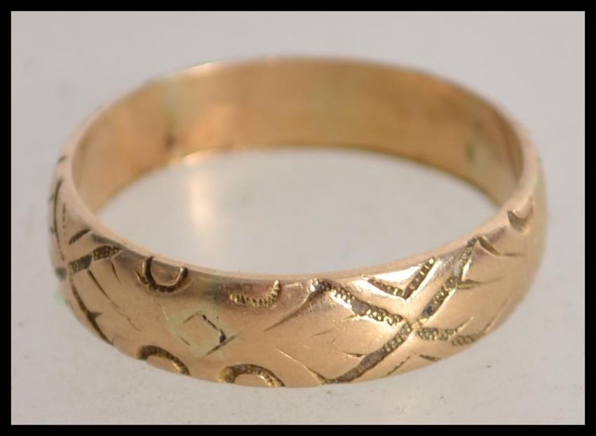 An 18ct gold hallmarked gents band ring being chase decorated. Hallmarked for Birmingham. Total weight 4.0g / Size P.5