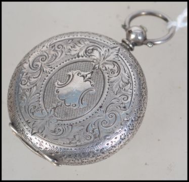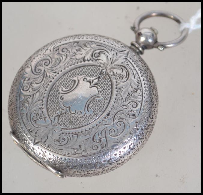 A continental ladies silver pocket watch. Having an enamel face with a  roman numeral chapter ring and painted floral display to the centre. Stamped with three bears to the inside of the case and EJ within an oval cartouche possibly for Emanuel Joseph. The case being chase decorated.
