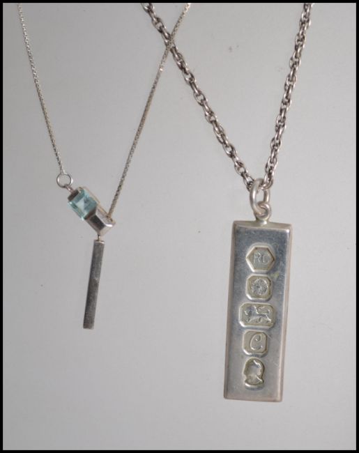 A silver hallmarked necklace ingot pendant by Robert Carr, hallmarked Sheffield, date letter C set to a silver 925 chain ( size 46cms chain ) also a pair of silver horseshoe earrings ( 4cms approx high )and a contemporary silver pendant and box linked necklace chain ( size 46cms chain ) . Total combined weight 27.6g.
