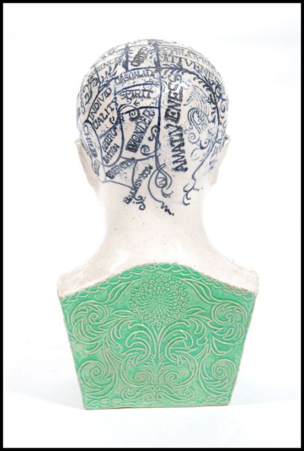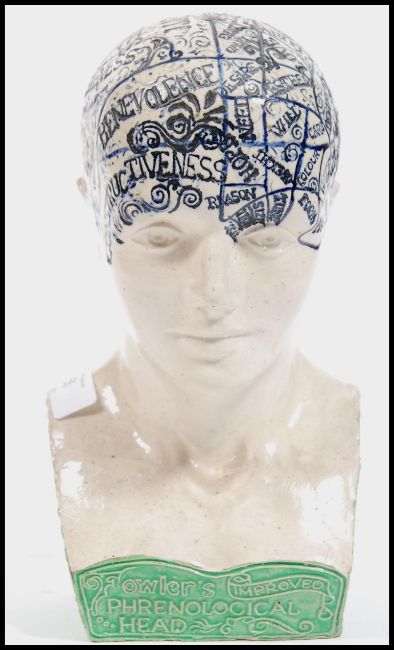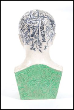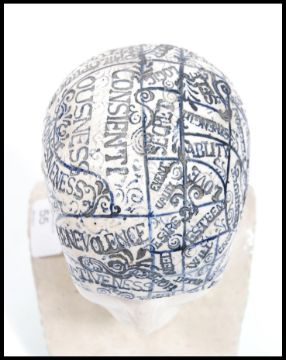 A 20th century china Phrenology head having section skull and raised on coloured bust plinth with notation for Fowler's Improved Phrenological Head. Measures 28cms high x 14cms wide x 16cms deep.