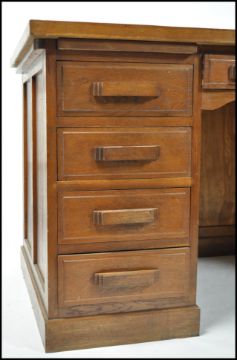 A 1920's Industrial oak twin pedestal office desk raised on plinths with upright pedestals each with banks of drawers having pull handles. Above a flared solid oak table top. Measures 77cms high x 150cms wide x 75cms deep.