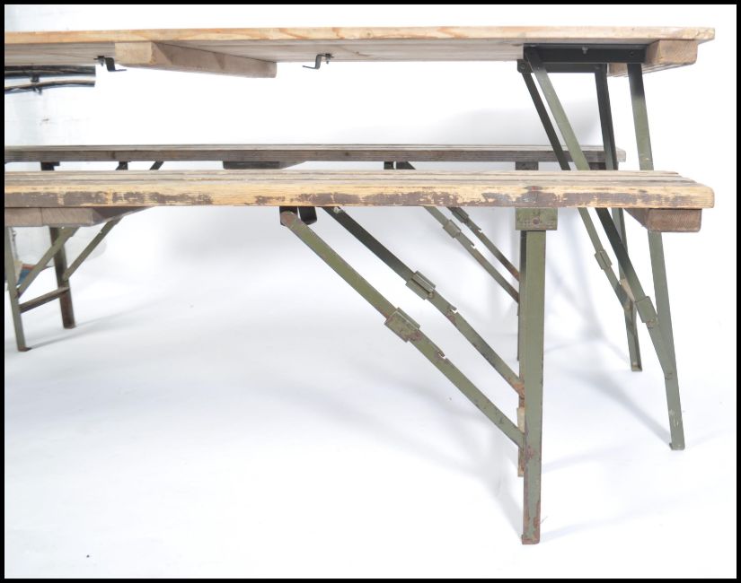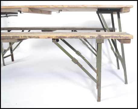 A vintage mid century war time Air Ministry folding refectory mess table  ( dining ) together with a set of folding benches. Stamped to underside with crows foot marking and makers.